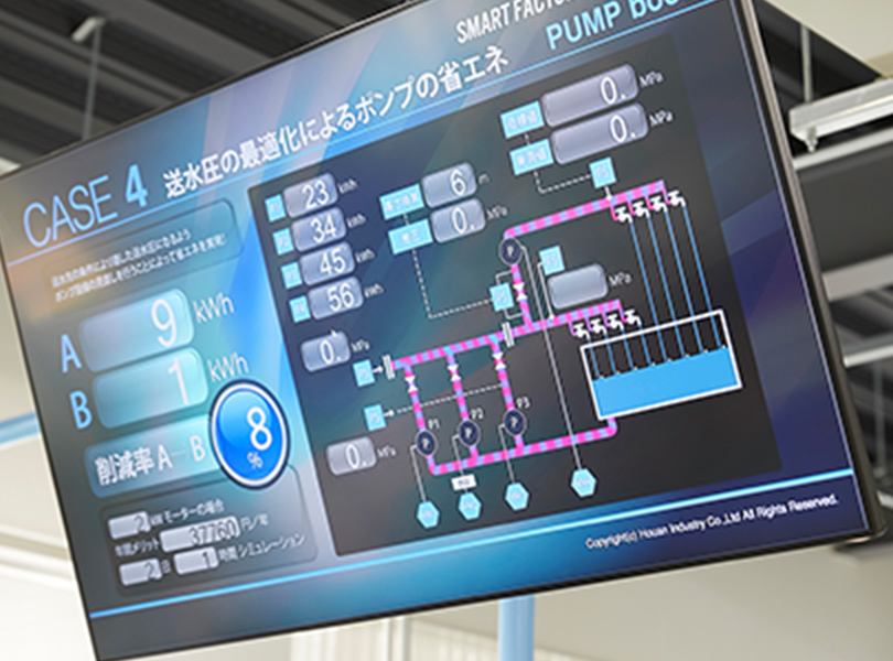 工場で使用する送水ポンプを用途別に再現し、効率的な運用方法を比較、体感ができます。