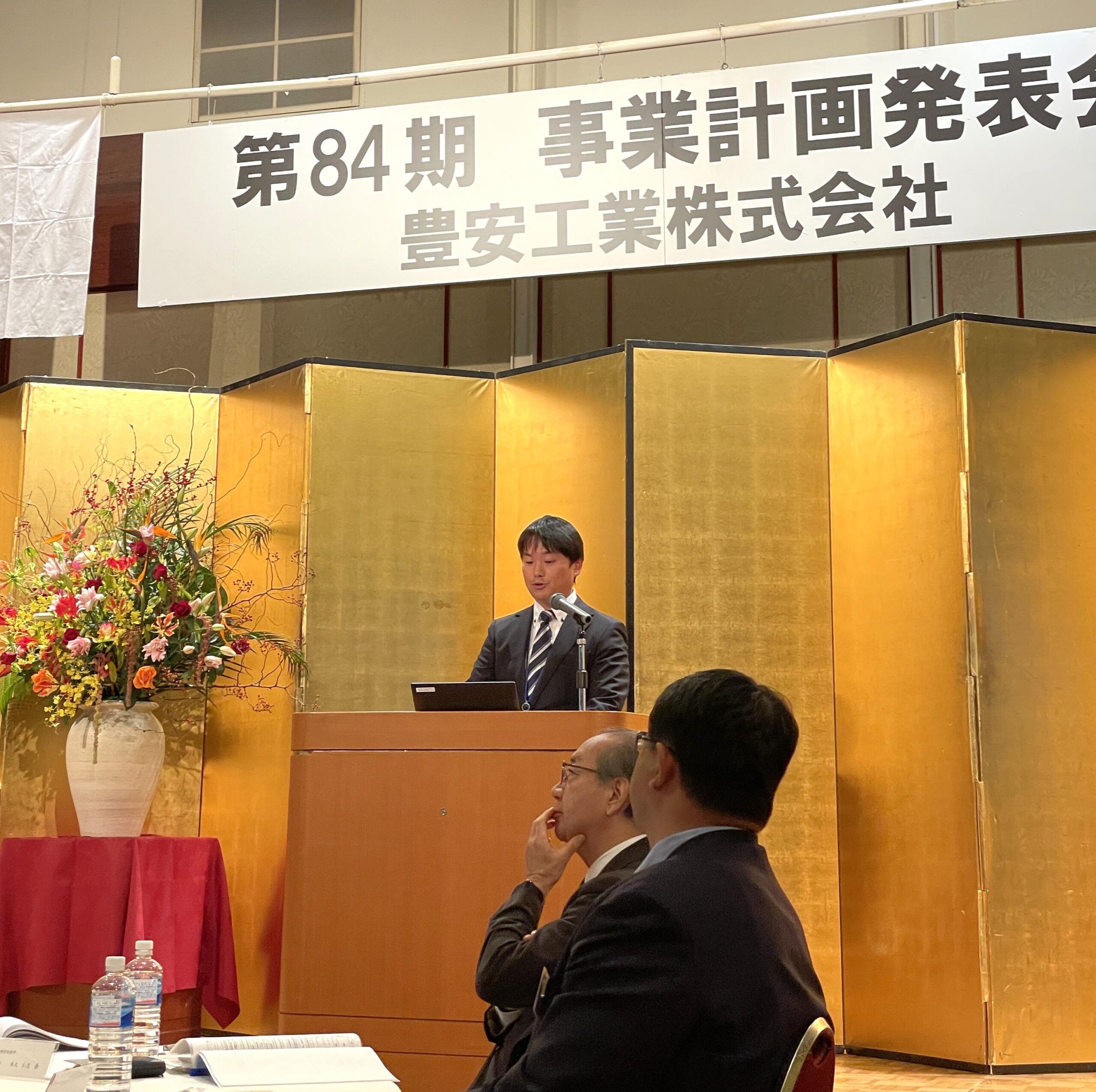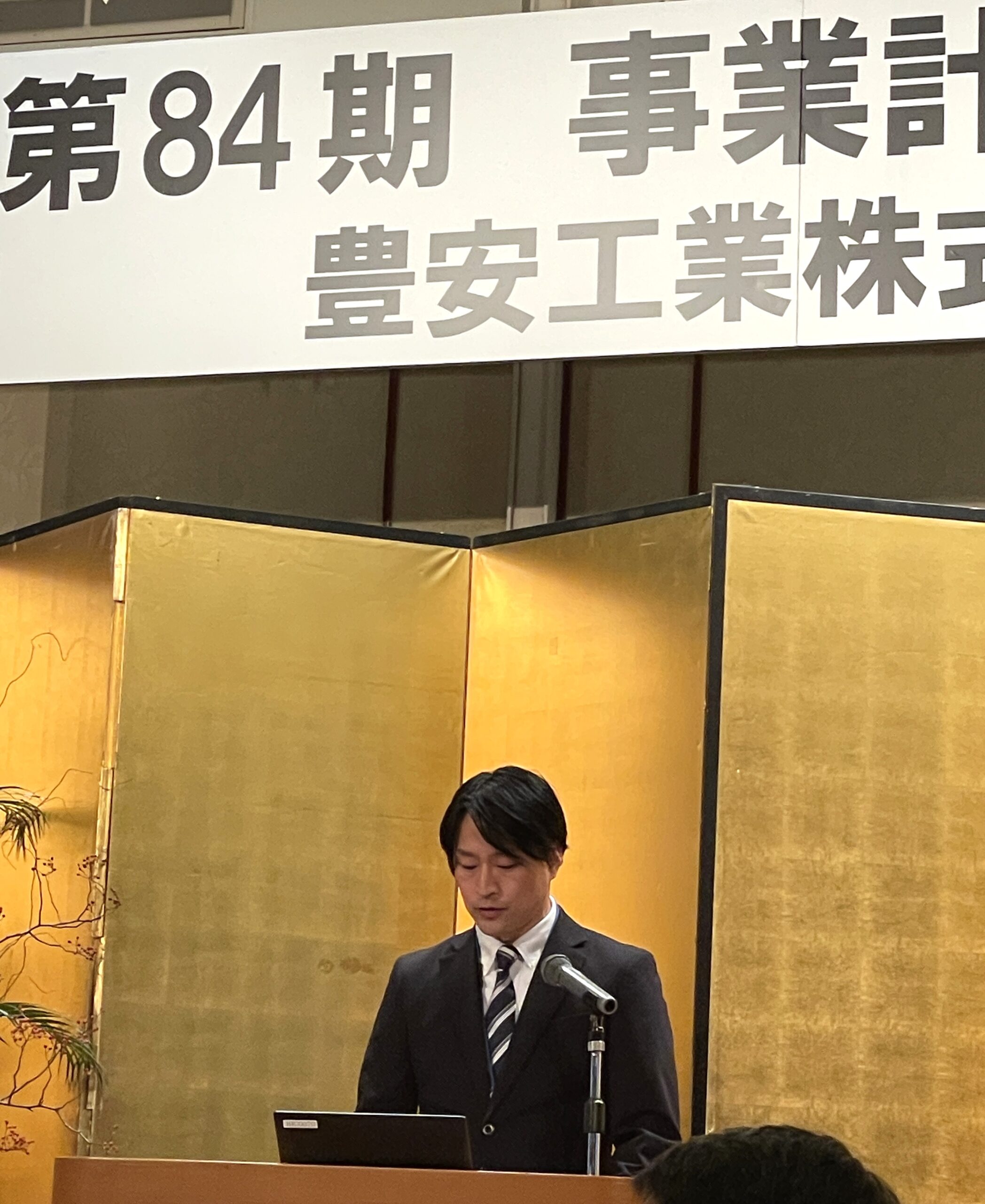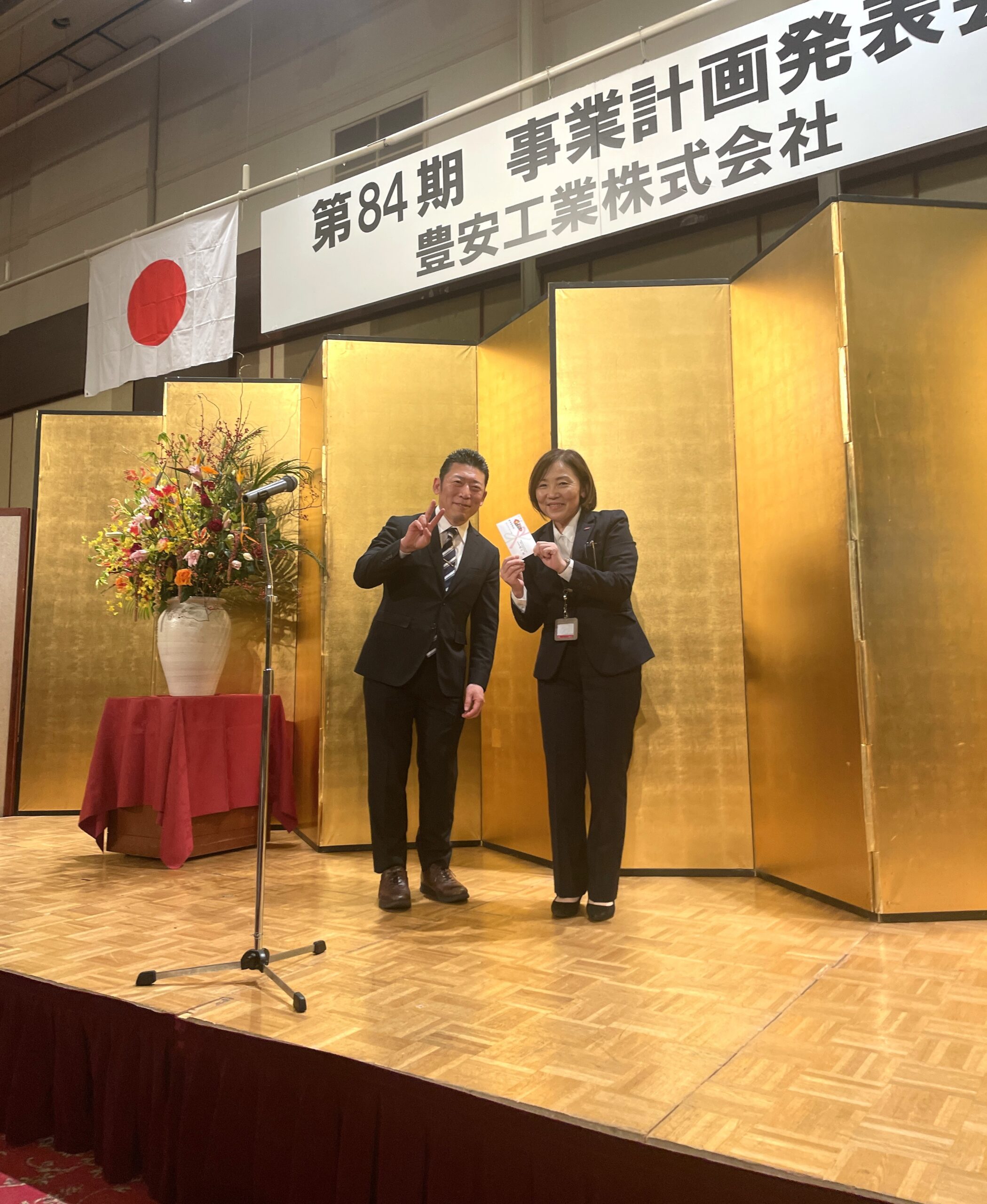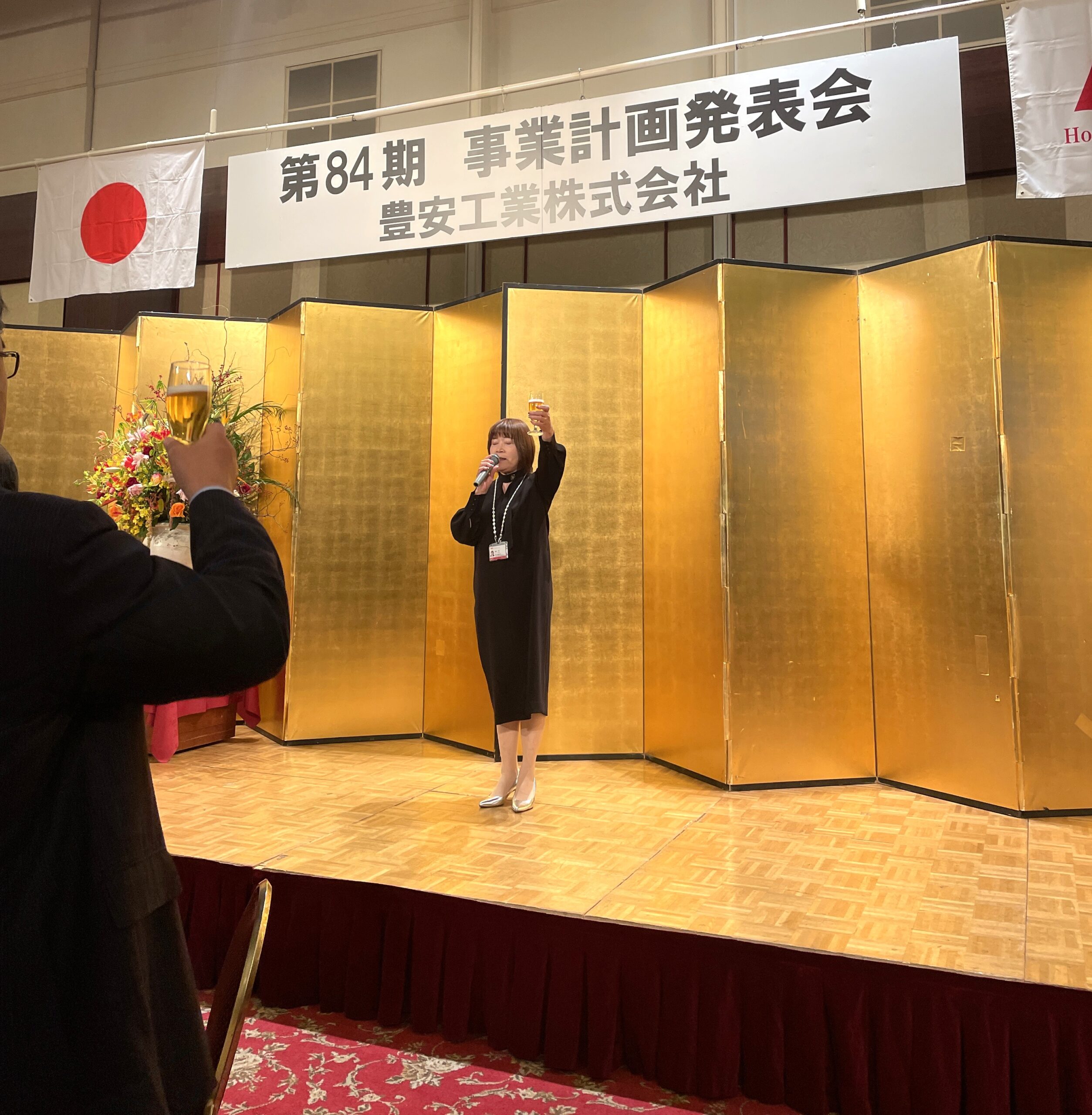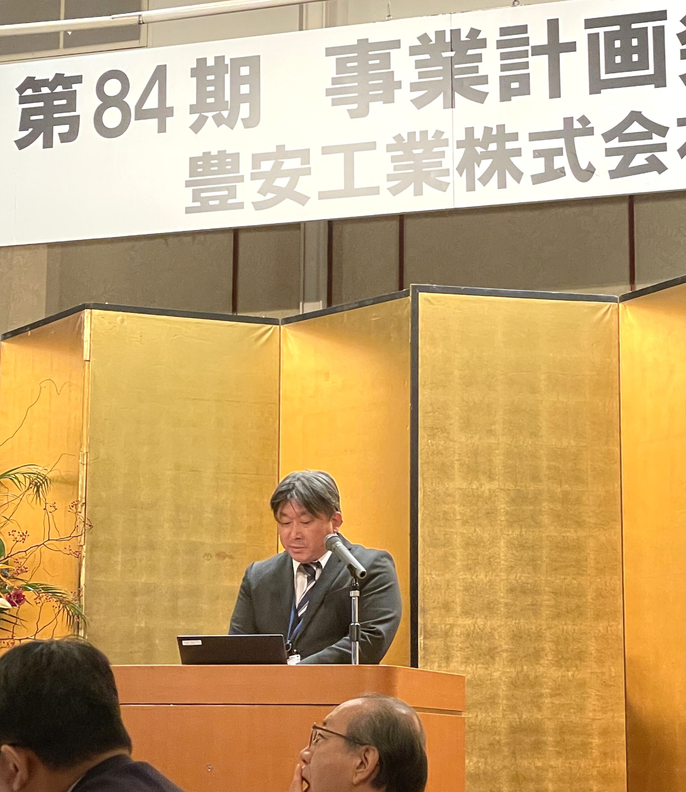 一年の報告と来期の方針、社員表彰もあります。今期を走り抜けてきた社員ひとり一人の成長を振り返ったり、頑張りが報われる瞬間に立ち会ったり…。豊安工業の一年の集大成を飾るイベントです。